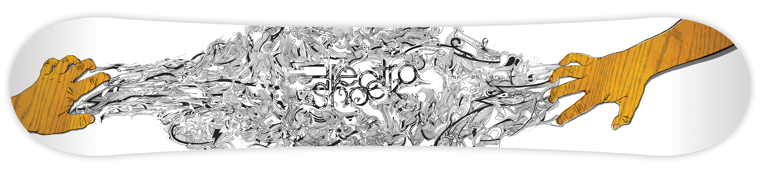 Supplied with the theme of 'electroshock' and the request for the 'THISISNOTIMPORTANT' detailed doodle style lettering, this project has dream project written all over it. I hand drew this 6' long drawing at size, so that I could pack in as much detail as possible. The agency folks at Apparatus Inc. & Sims fell in love with the board design.